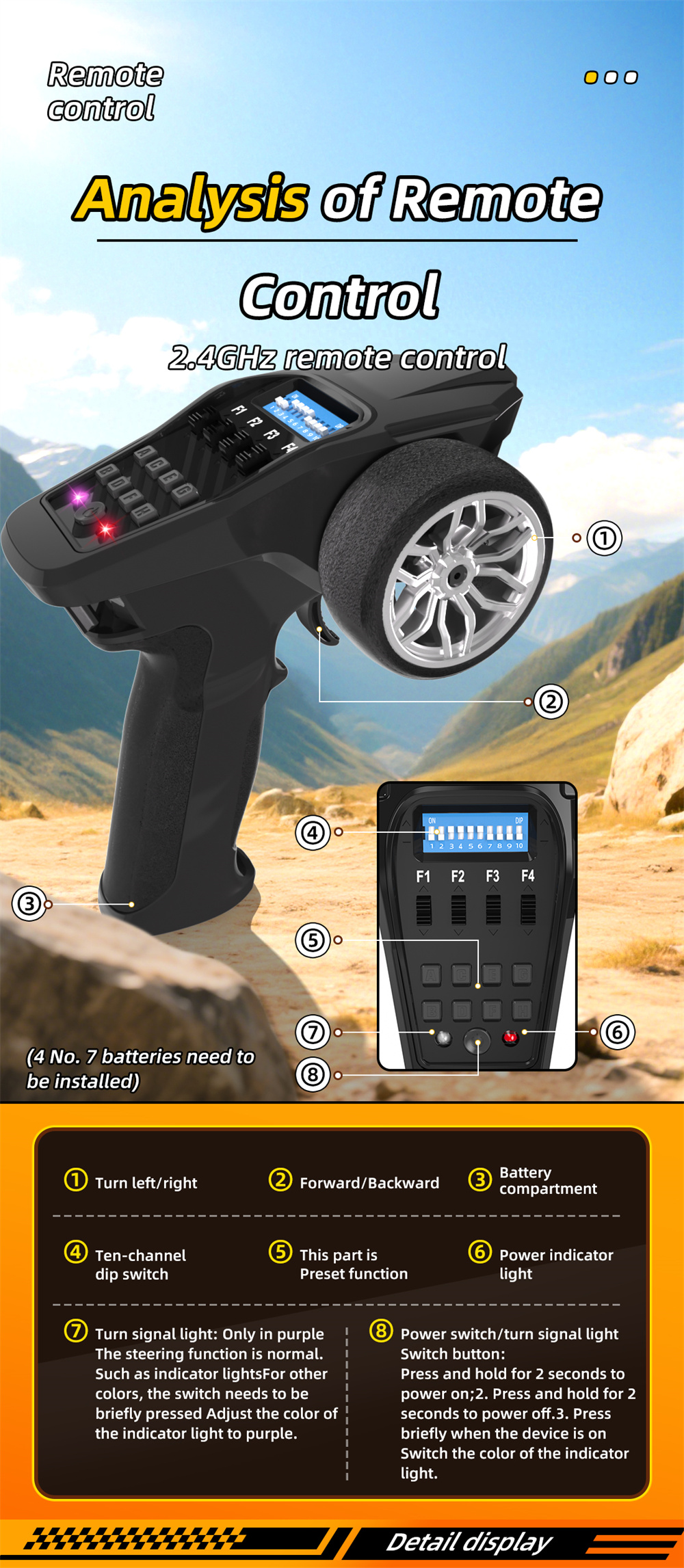 | Transmitter | Frequency:2.4G Channel:4CH Remote Distance:>30m Battery:4X 1.5V AAA(not included) |