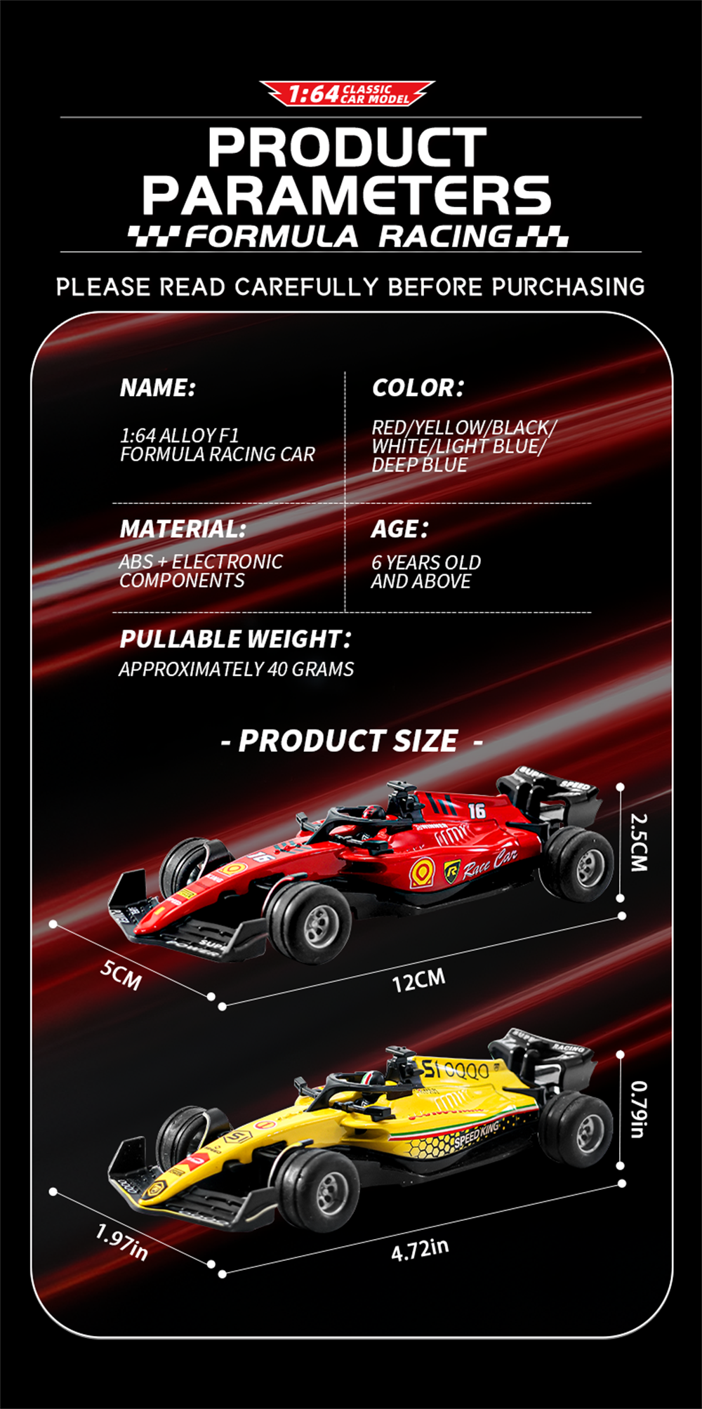 Car Size:5*12*2.5cm Box Size:13.4*5*6.8cm |