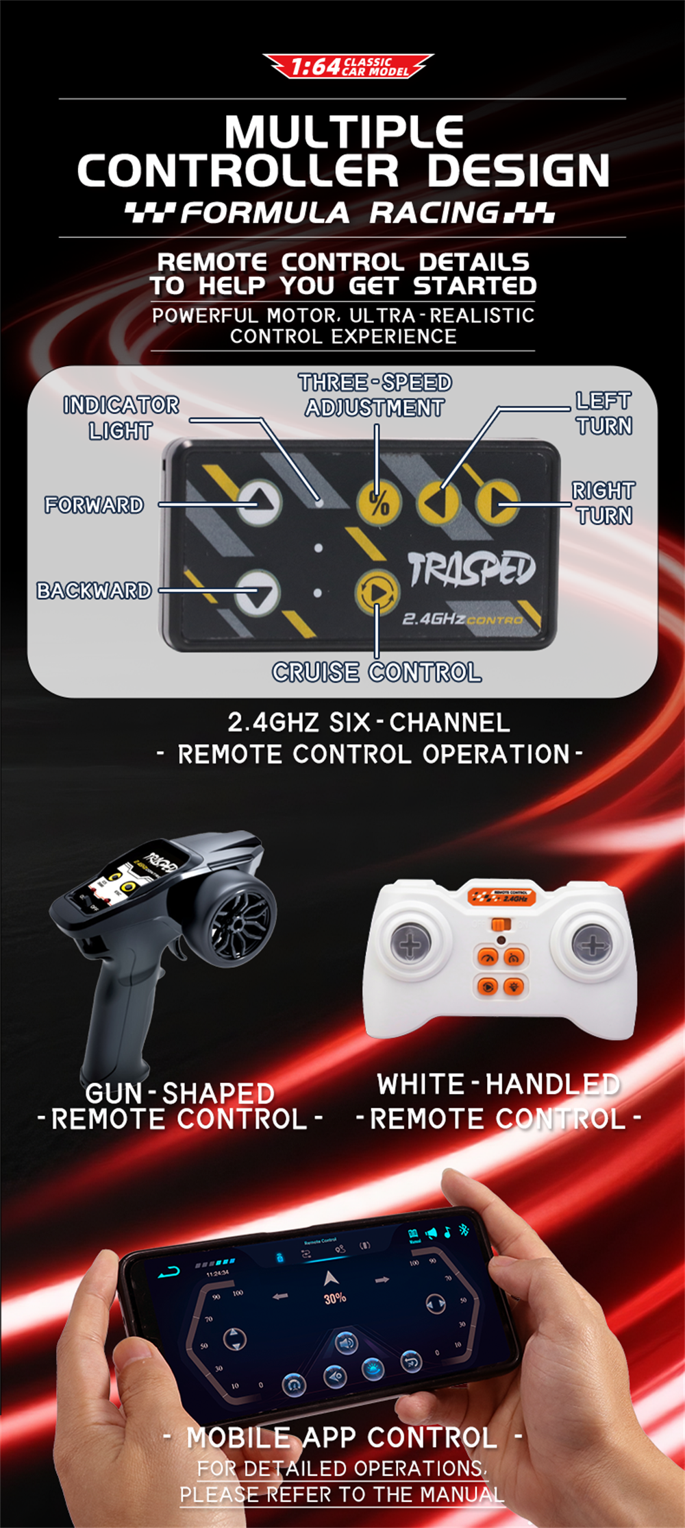 4. 2.4G + mobile app dual remote control for smooth operation