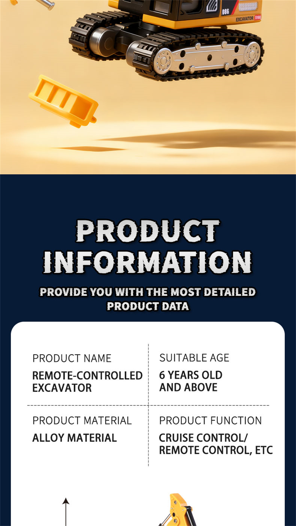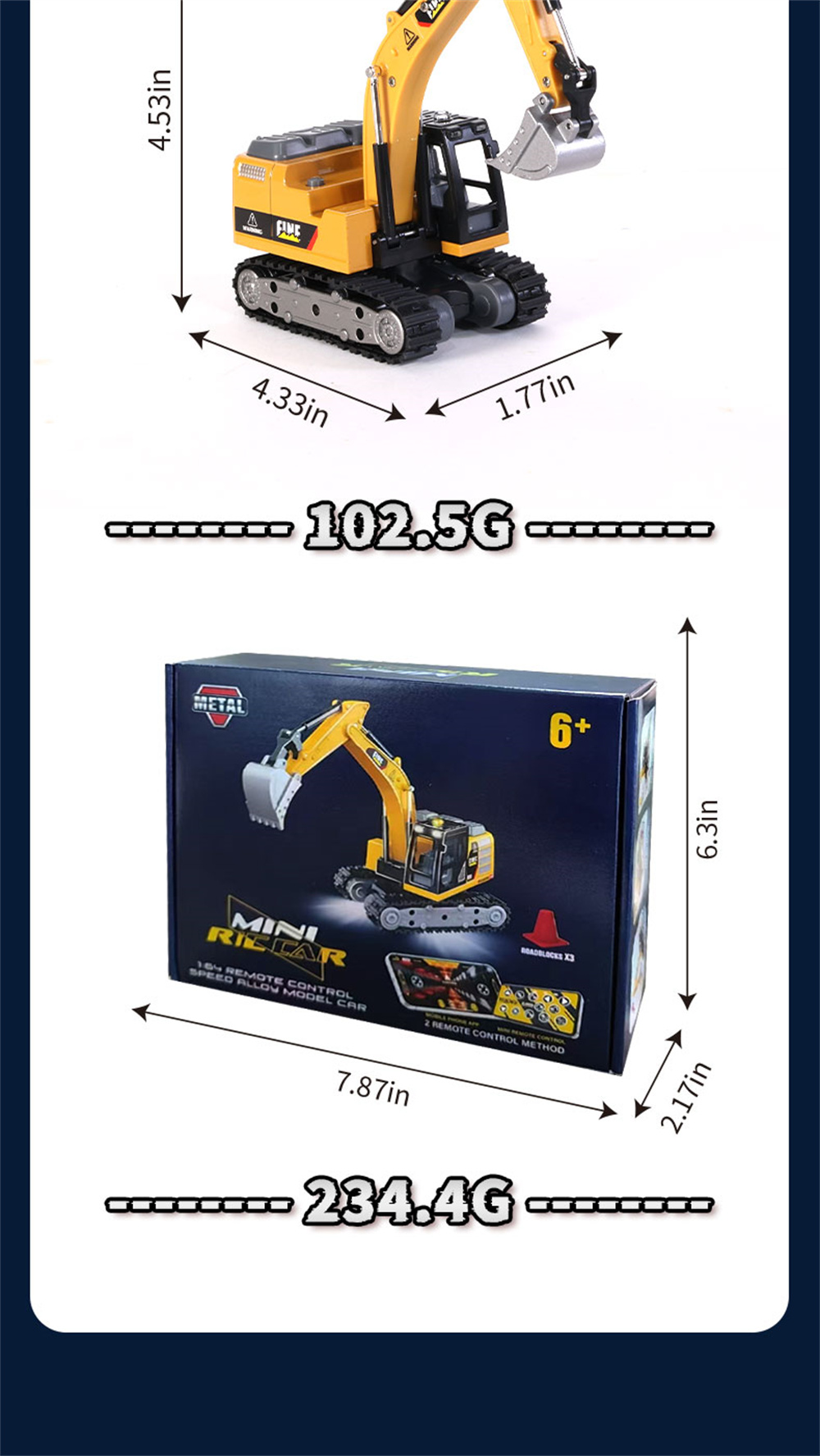 Material:Alloy,ABS and electronic components Excavator Weight:About 102.5g Box Weight:About 234.4g |