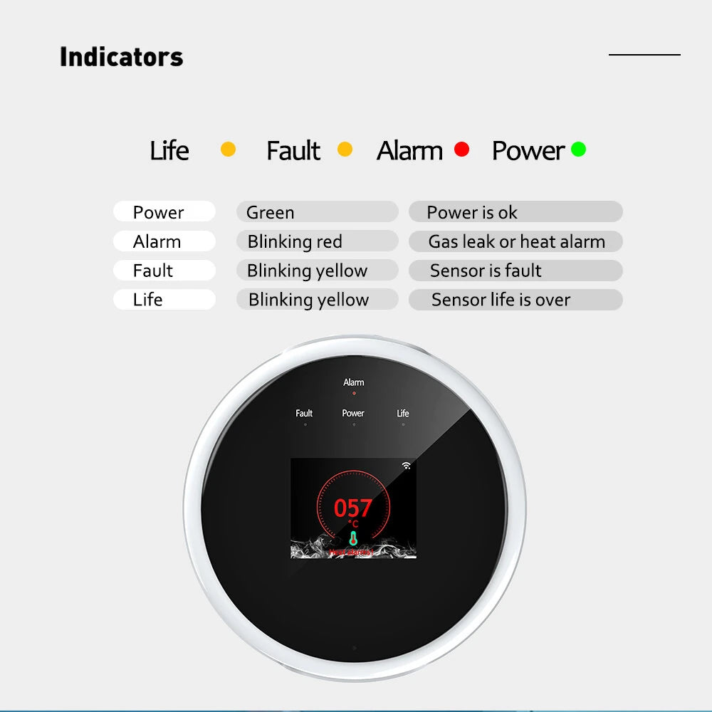 2. Temperature Sensing: The built-in heat sensor functions as a fire alarm, activating when the surrounding temperature reaches 57°C, thus offering dual protection against gas leaks and fires.