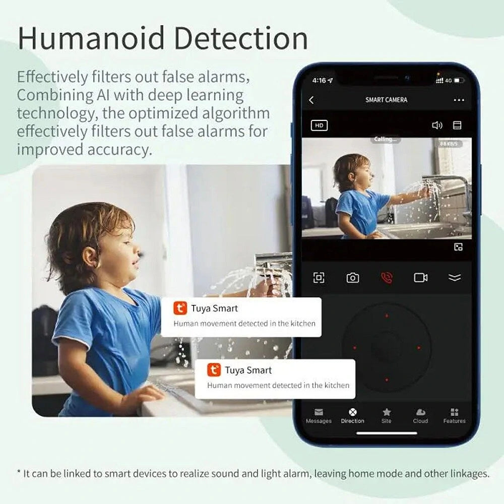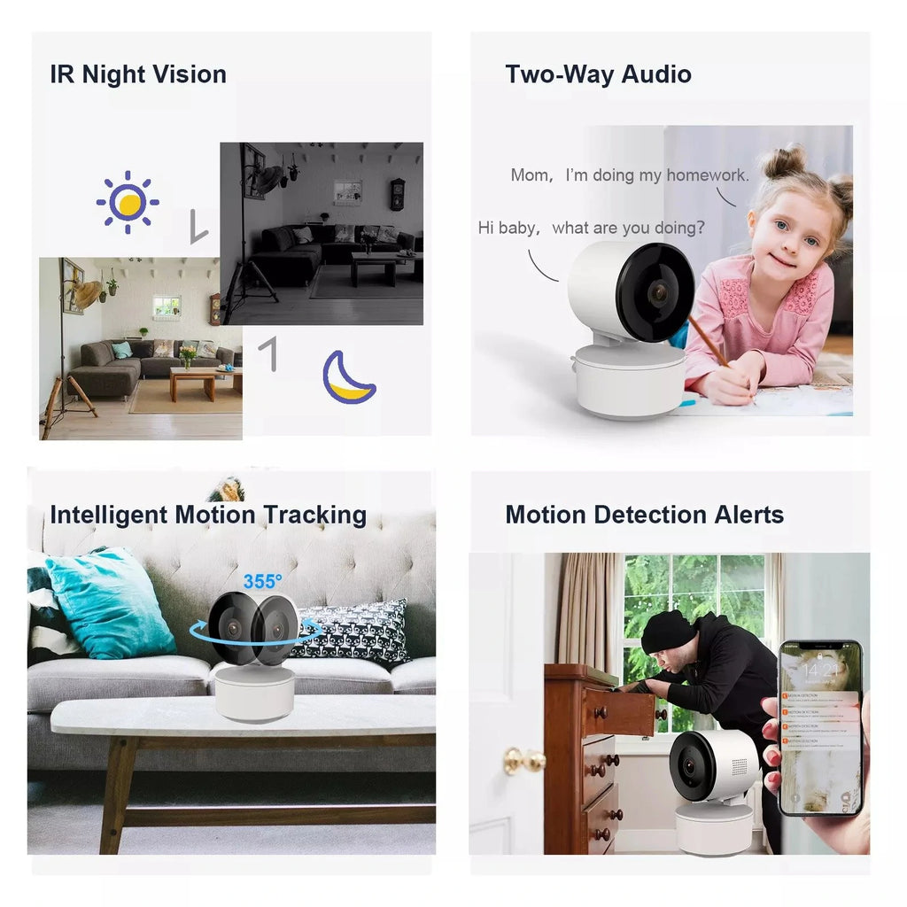 Features:●1080P Full HD video quality, live stream, and watch recordings●Wide viewing angle, see more of every moment●Intelligent Auto- Tracking●2.4GHz WiFi wireless connection, no network cord required●Support local storage by MicroSD card up to 128GB●Support 2-way audio between phone and camera●Support 7*24H video recordings, never miss every moment●Free APP provided, support remote viewing on ios or Android●Support Tuya cloud storage for motion detected recordings●Powering by universal power adapter (Micro USB Port, DC5V/1A)●Flexible installation by wall screws●Pan 355 degree Tilt 80 degree