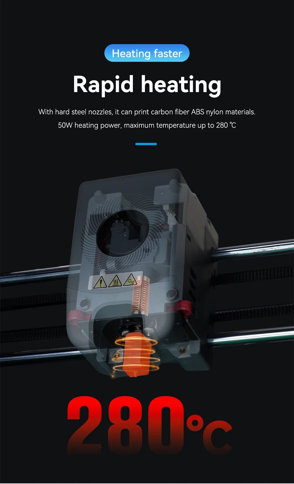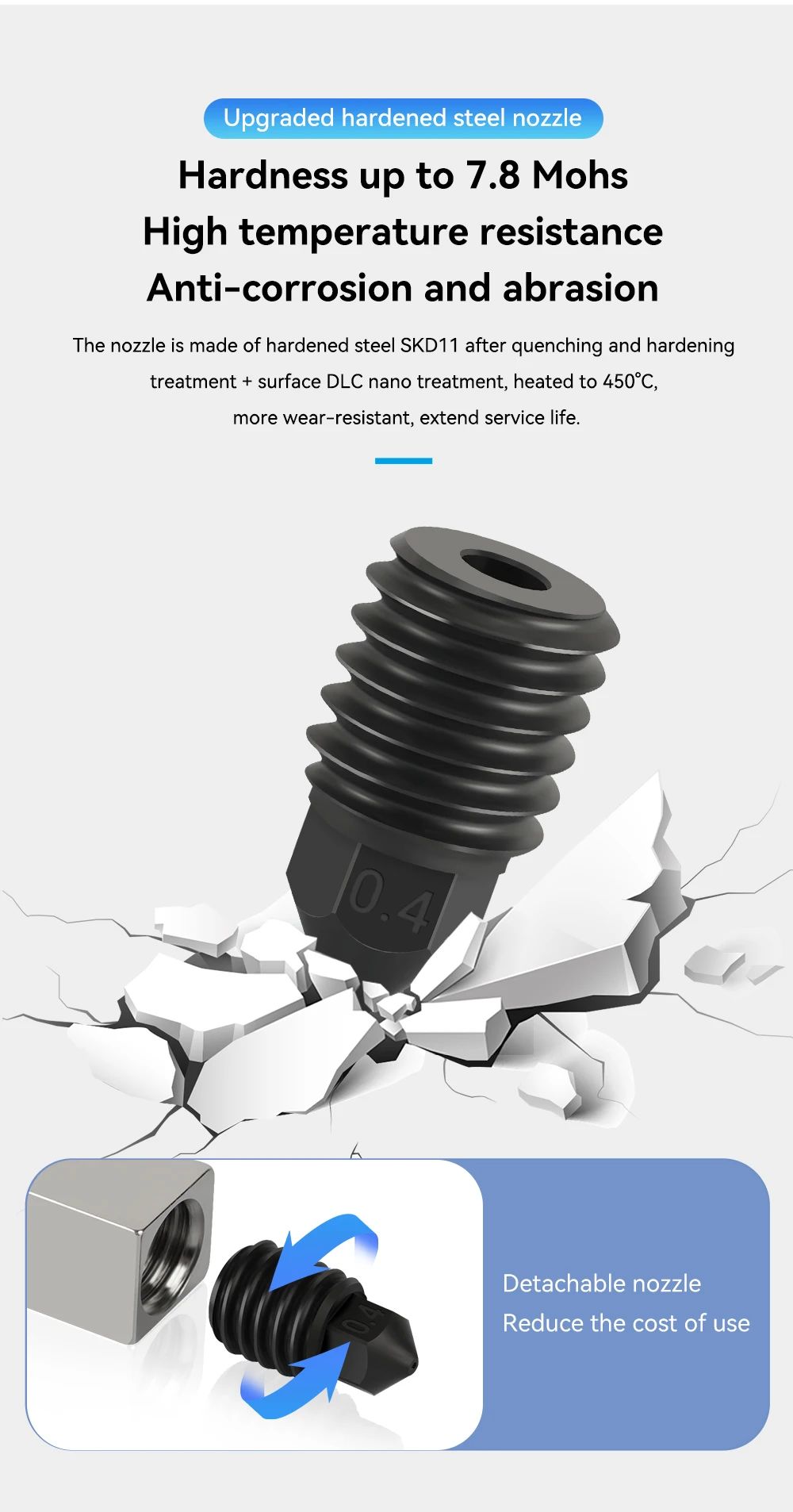 3. Hardened Steel Nozzle: Upgraded nozzle with 7.8 Mohs hardness and anti-corrosion treatment, capable of withstanding up to 450°C.