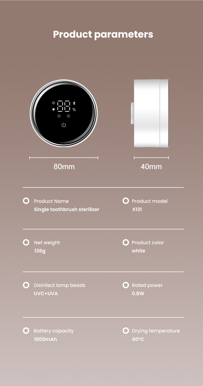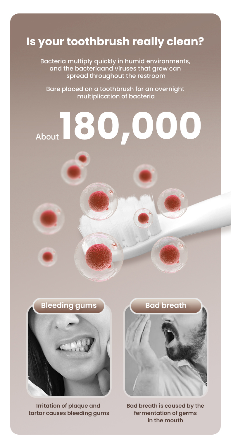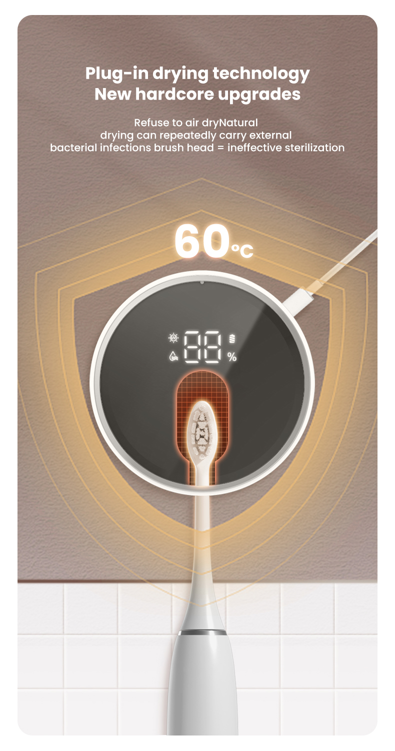 - Efficient Drying Technology: The device utilizes plug-in drying technology, providing a consistent 60°C heating environment. This advanced feature effectively removes moisture, ensuring that the toothbrush stays dry and free from bacterial growth.