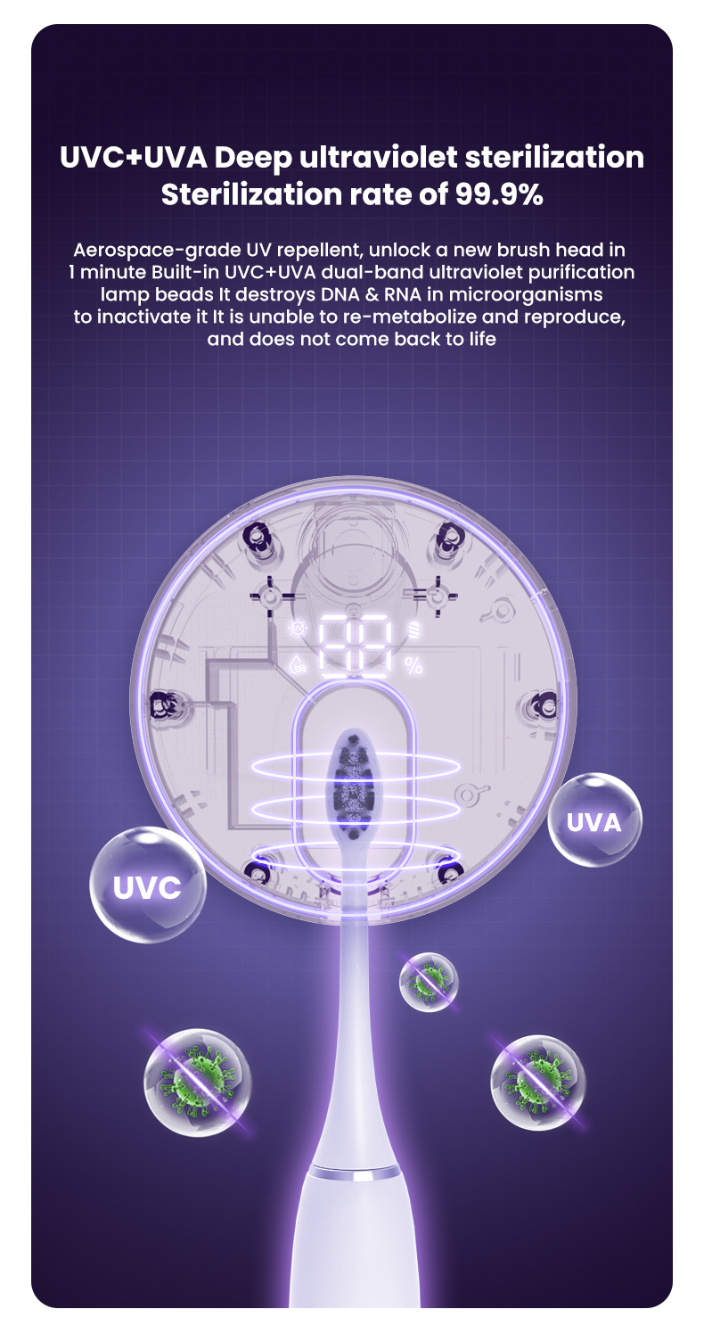 - Advanced UV Sterilization: Equipped with dual-band UVC+UVA lamp beads, this sterilizer achieves a 99.9% sterilization rate. The high-grade UV purification destroys the DNA and RNA of bacterias, rendering them inactive and unable to reproduce.