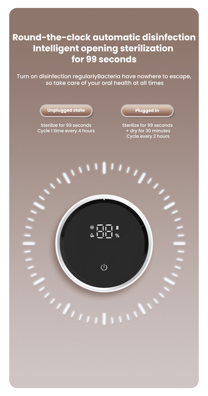 - Round-the-Clock Automatic Disinfection: In battery mode, it sterilizes for 99 seconds every 4 hours. When plugged in, it sterilizes and dries every 2 hours with a 99-second sterilization and 30-minute drying cycle, ensuring optimal hygiene.