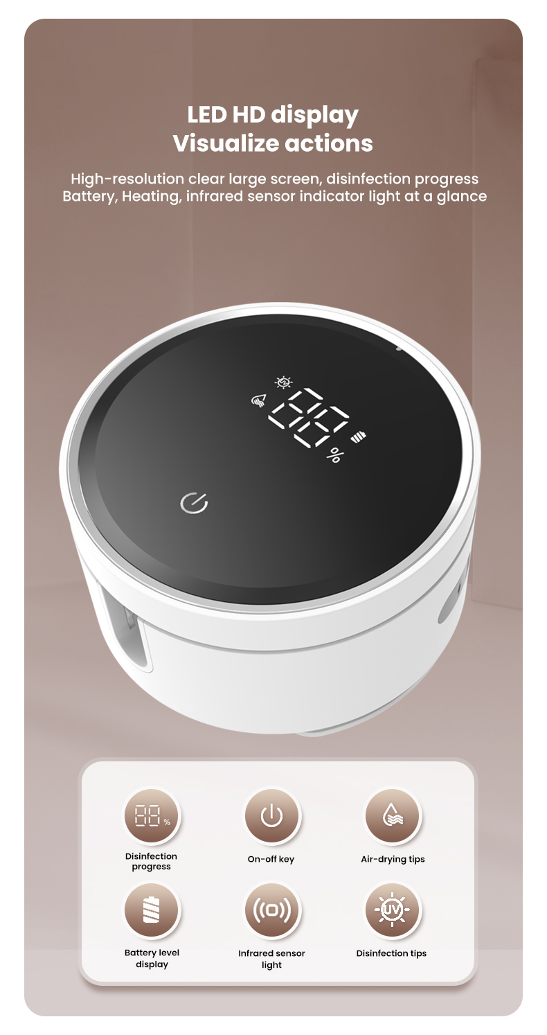 - LED HD Display: An integrated high-resolution LED display provides clear visuals of disinfection progress, battery status, heating, and infrared sensor indications. Easily keep track of the sterilizer's operations with a quick glance at the informative screen.