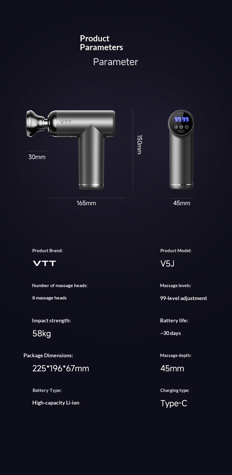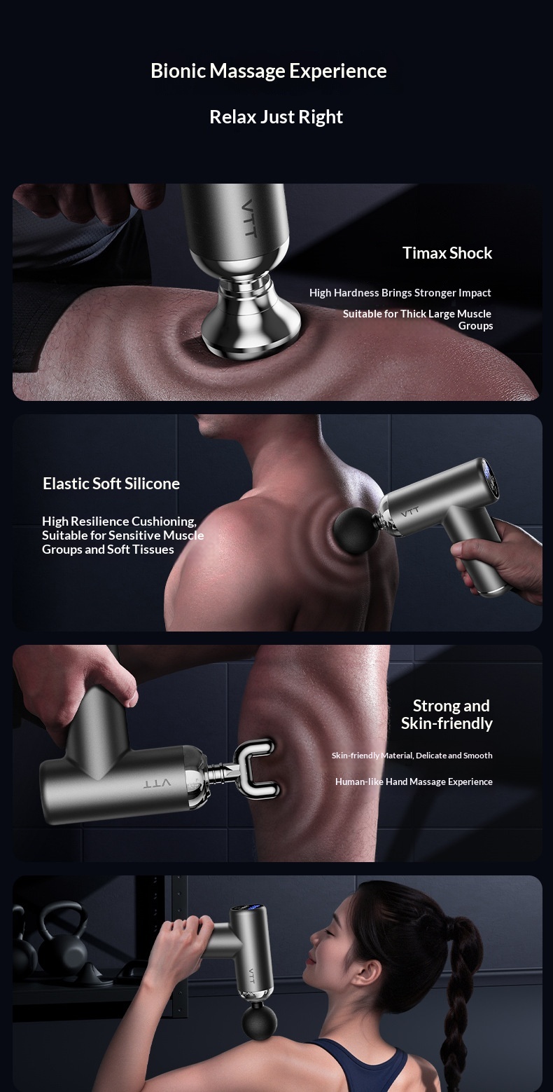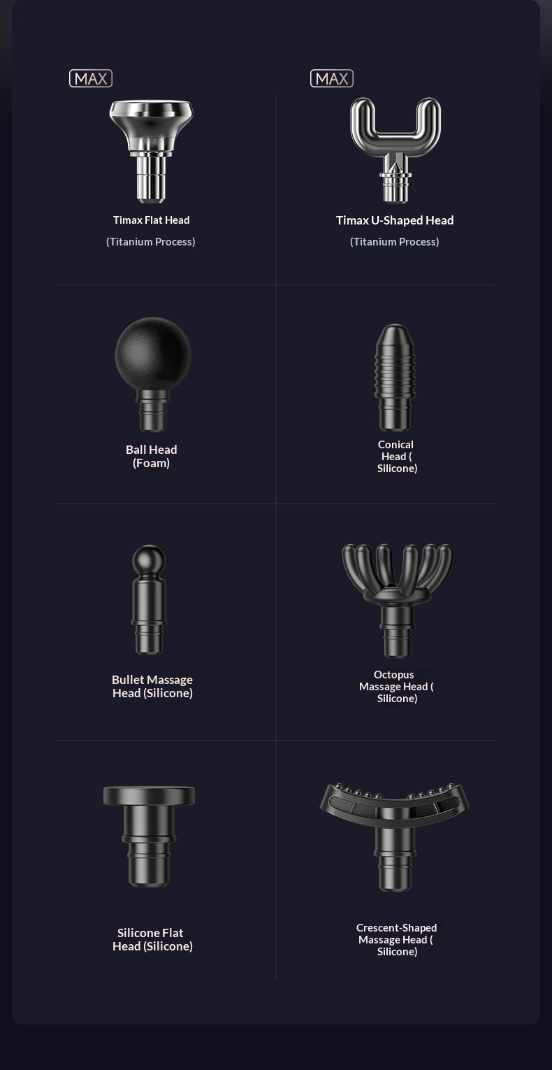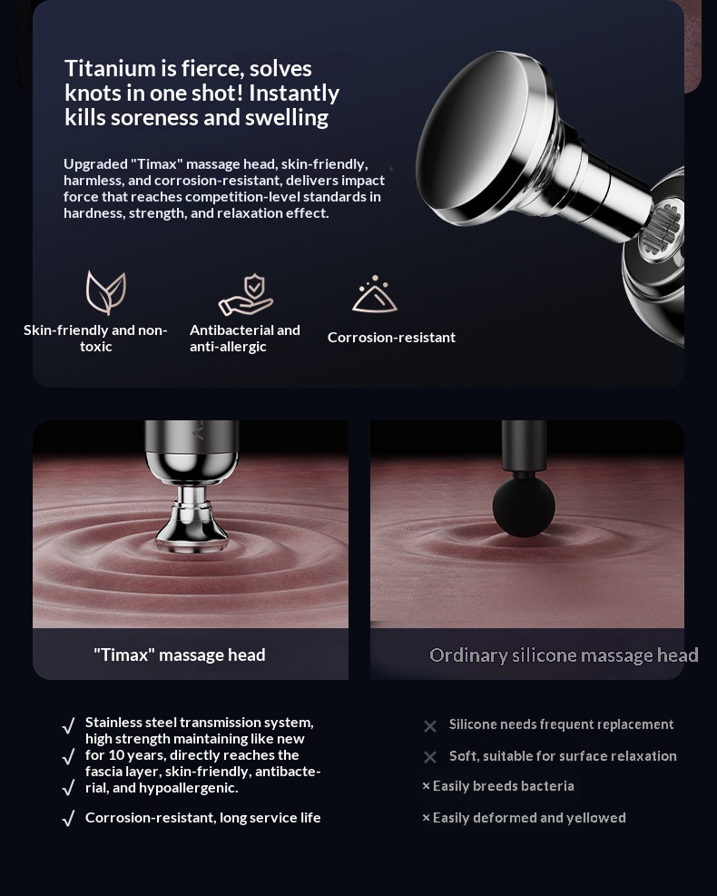 - Full‑body coverage: 8 interchangeable heads, from firm metal heads to soft tips for sensitive areas.
