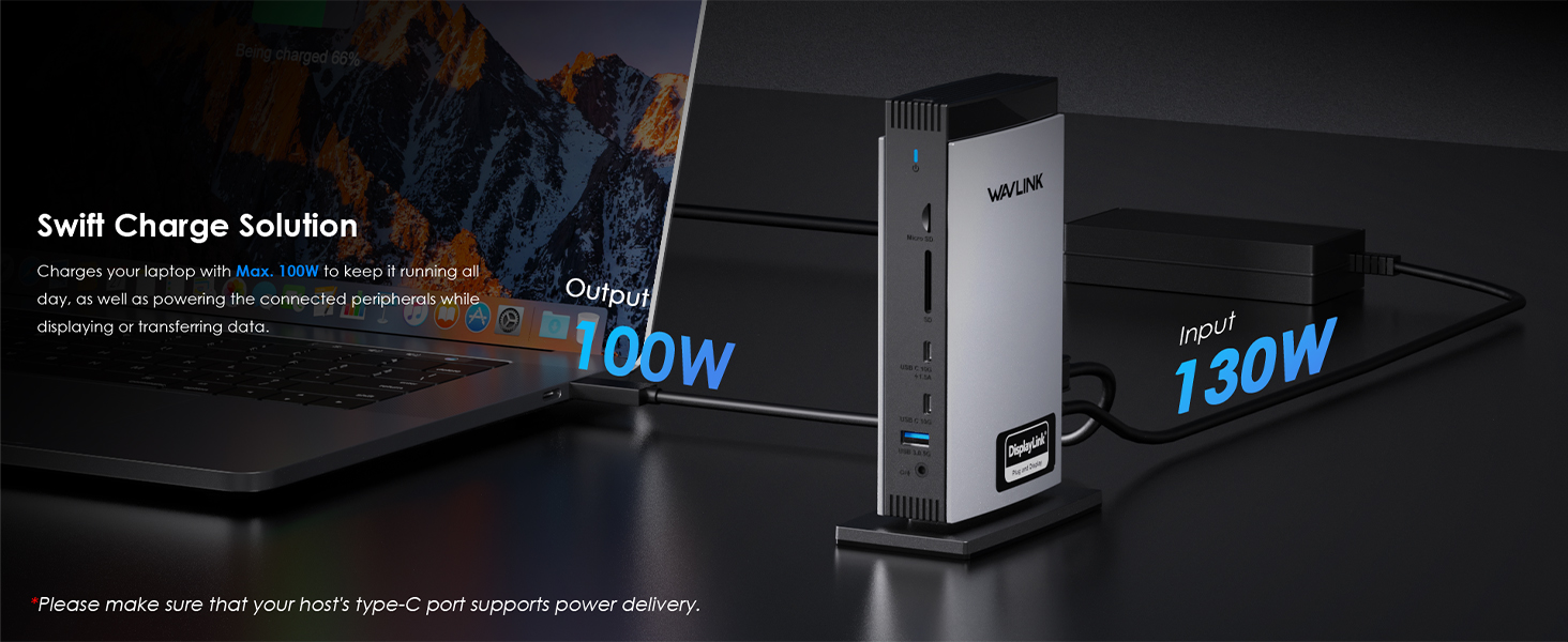1. Working with USB-C, Thunderbolts & USB-A laptops.2. 130W power adapter with maximum 100W upstream charging for your laptop via USB-C Host port.