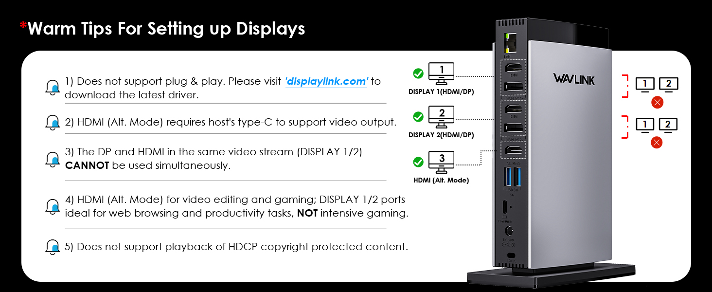 8.DISPLAY 1/2 port is suitable for office work, processing spreadsheets, documents or browsing web pages. Not suitable for playing games or other high-intensity tasks.