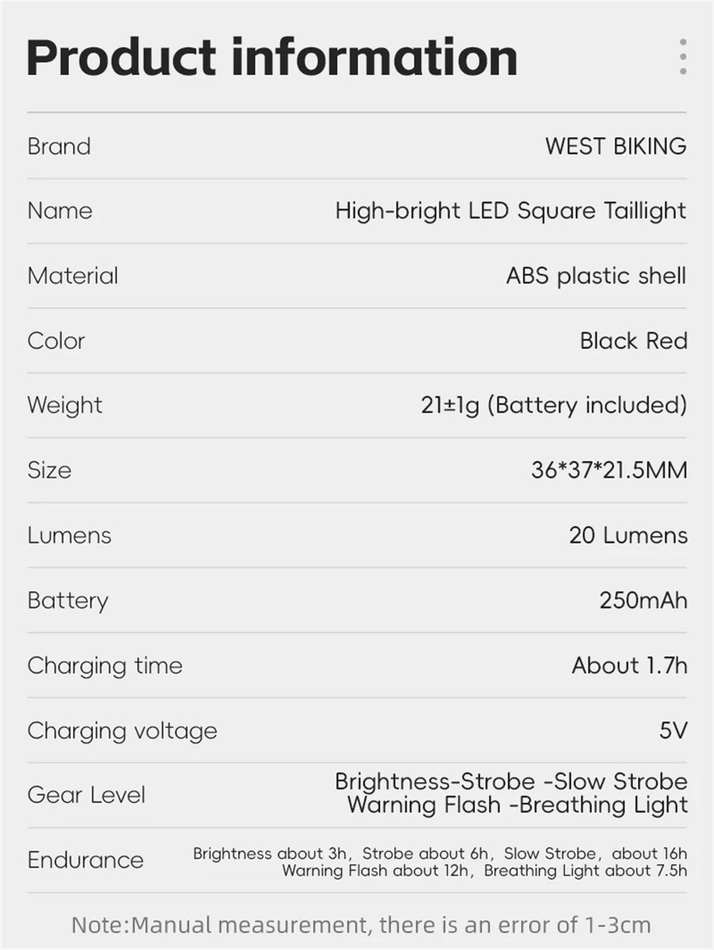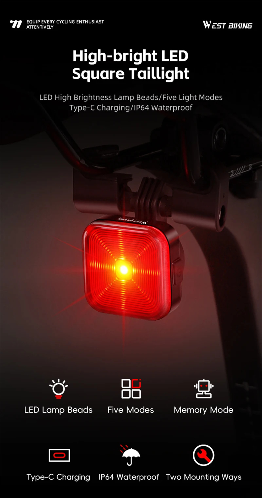 1. Bike Rear Led|Square Taillight|IP64 Waterproof Rating: IP64 waterproof rating ensures the taillight withstands rain and splashes, perfect for all-weather cycling.