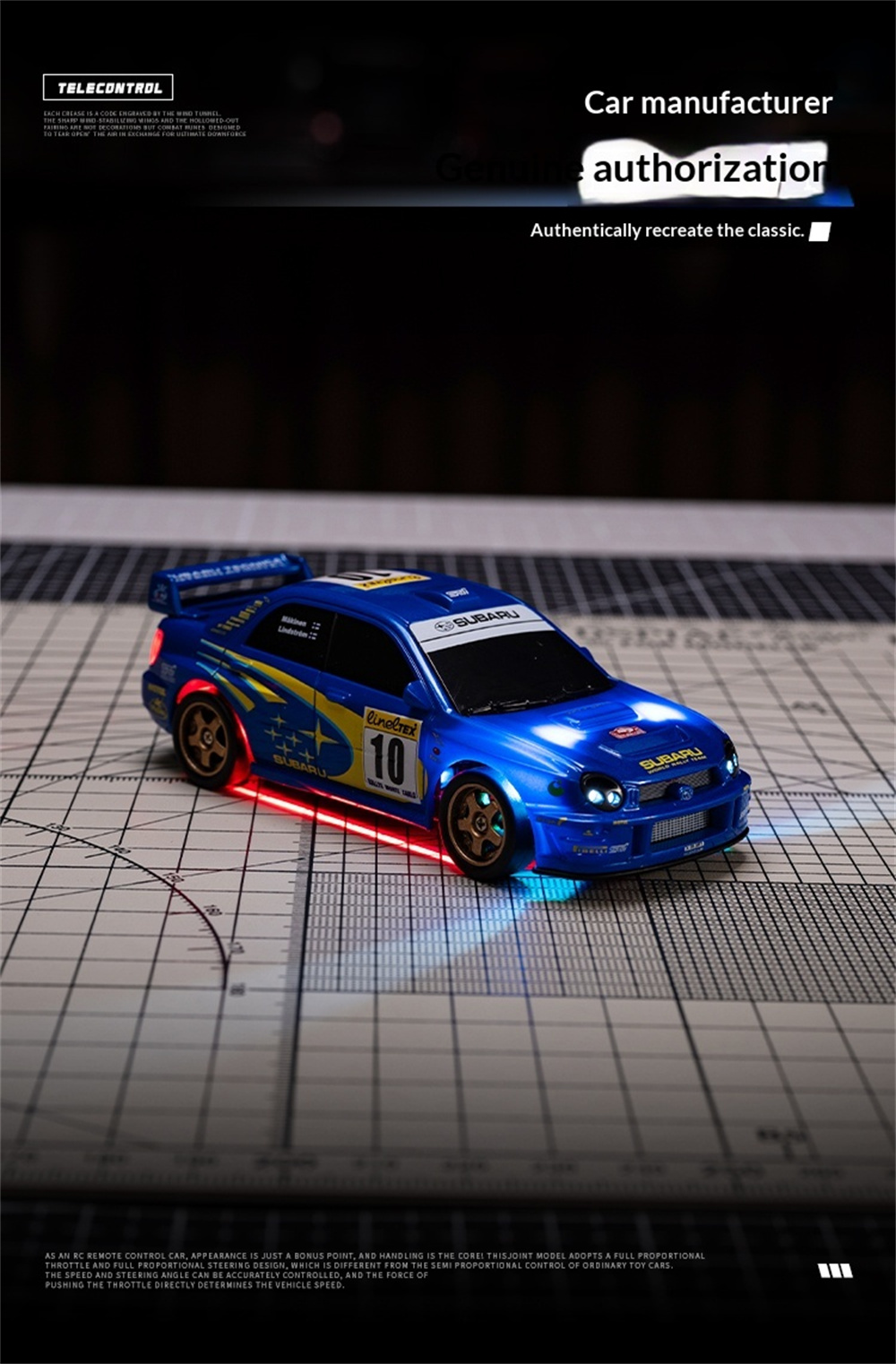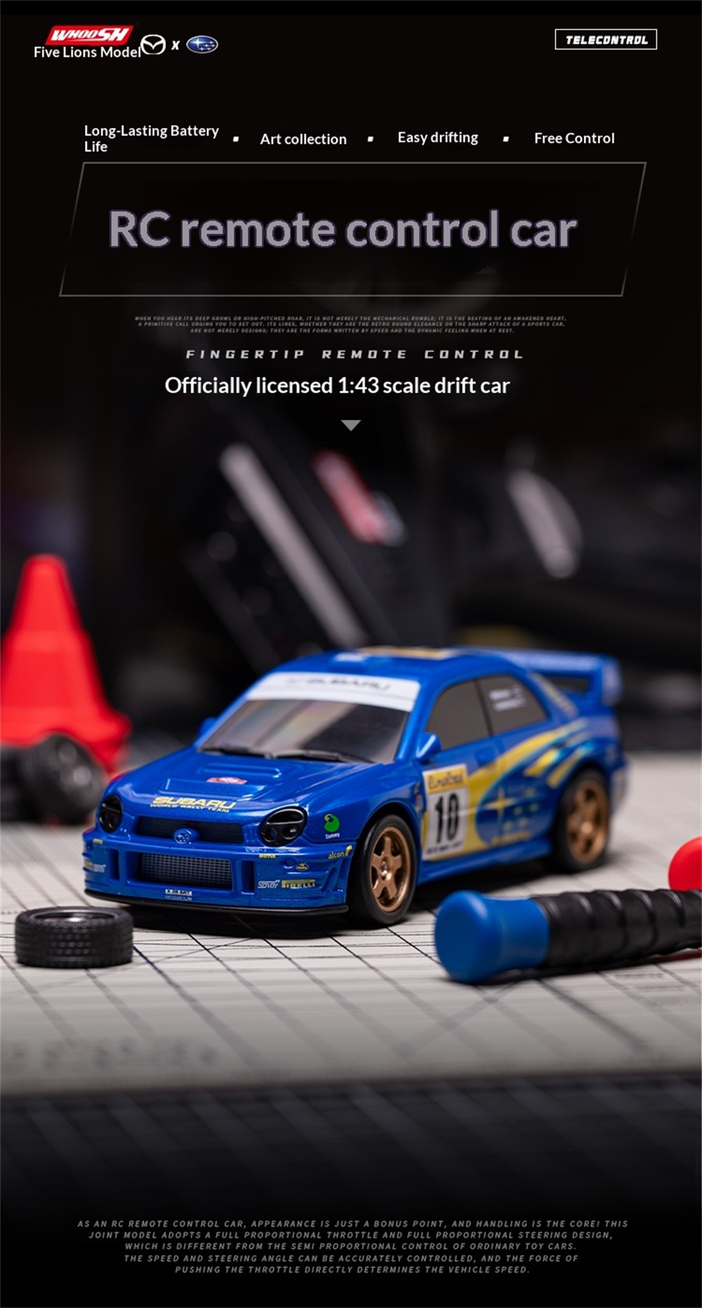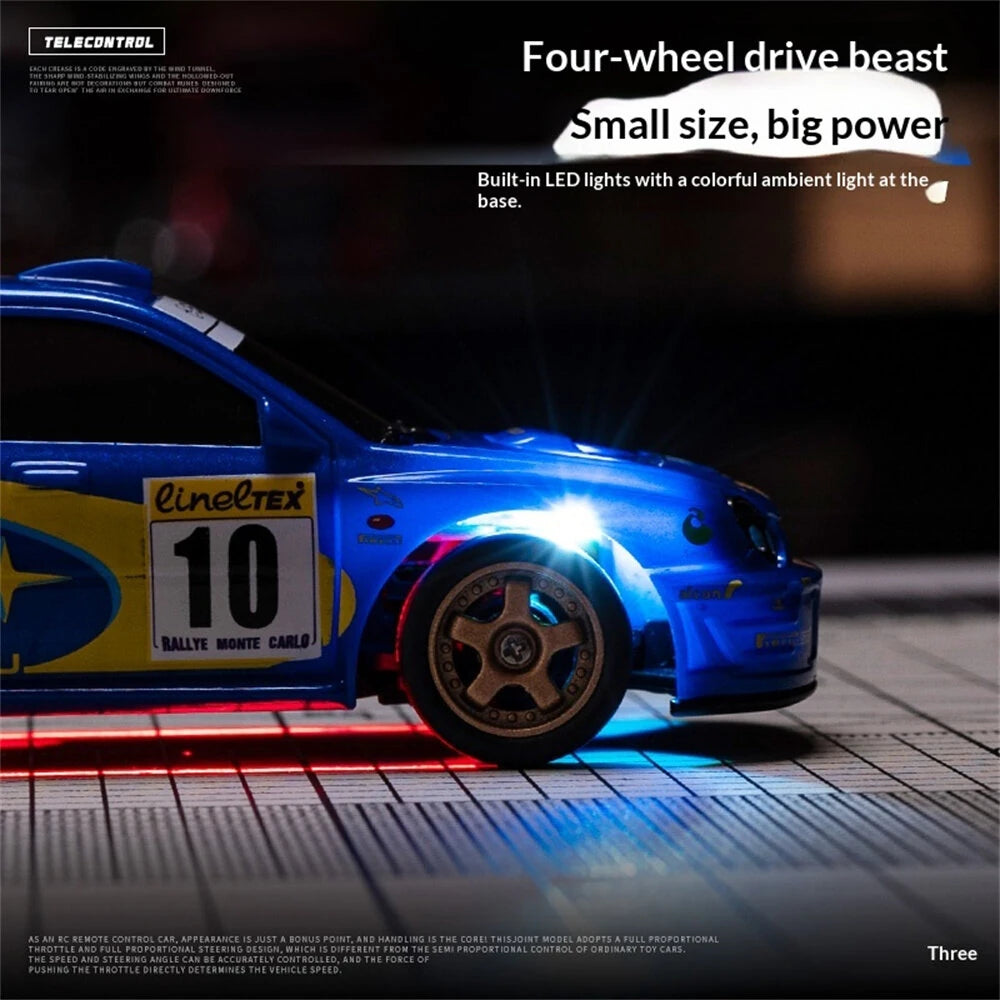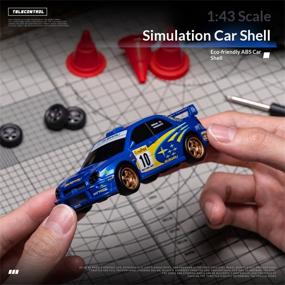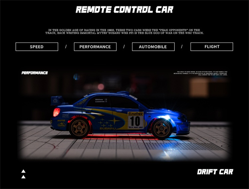 This premium MINI drift car is officially licensed by for Subaru, featuring a nylon chassis and four-wheel drive. The styling is a 1:43 scale duplicate of the real car, with the exterior completed to the actual proportions. It comes with a 2.4G four-way remote control, front and rear lights, and ambient lighting underneath the car. It has a continuous battery life of 20-25 minutes and includes a complete set of drift tires for replacement. It also features obstacle courses and a remote control distance of 25-30 meters.