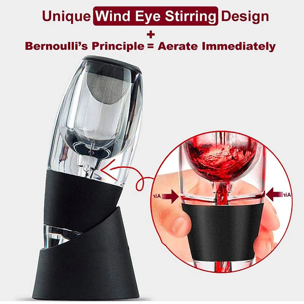 - Unique Wind Eye Stirring Design: Utilizing Bernoulli's principle, the aerator features a unique wind eye stirring design that mixes wine with air instantly. This process removes SO2 and oxidized tannin effectively, enhancing the wine's flavor and making it more mellow.