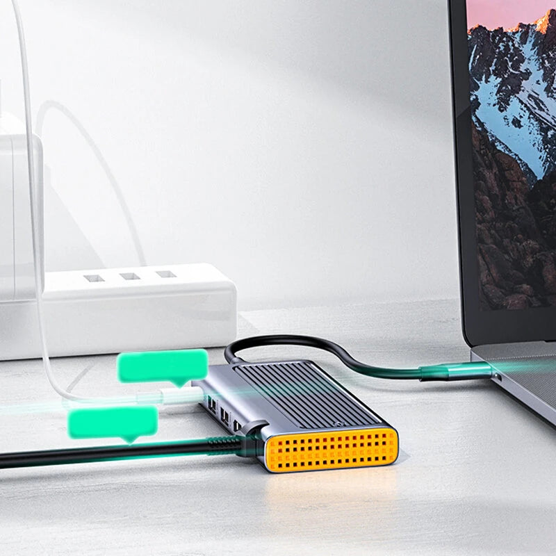 1. 6-In-1 Multi-Port Connectivity:Combines USB3.2*2, USB-C PD100W, 4K HD, RJ45 Ethernet, and M.2 NVMe&SATA SSD case for comprehensive connectivity and expansion options.