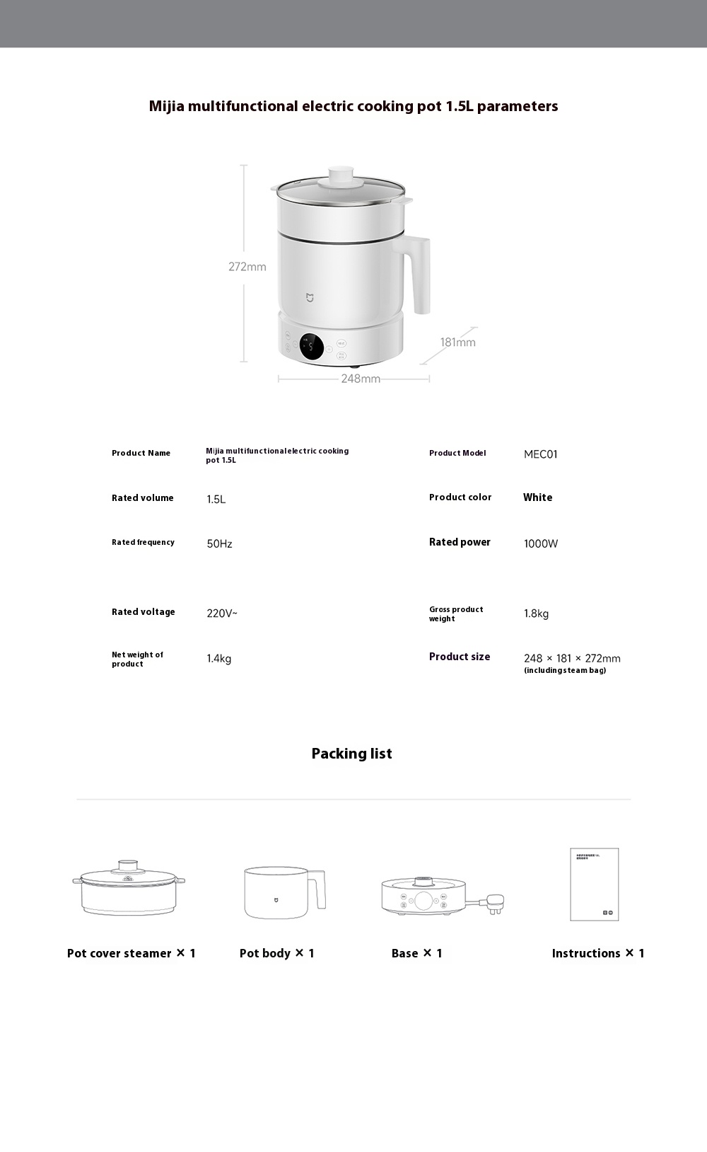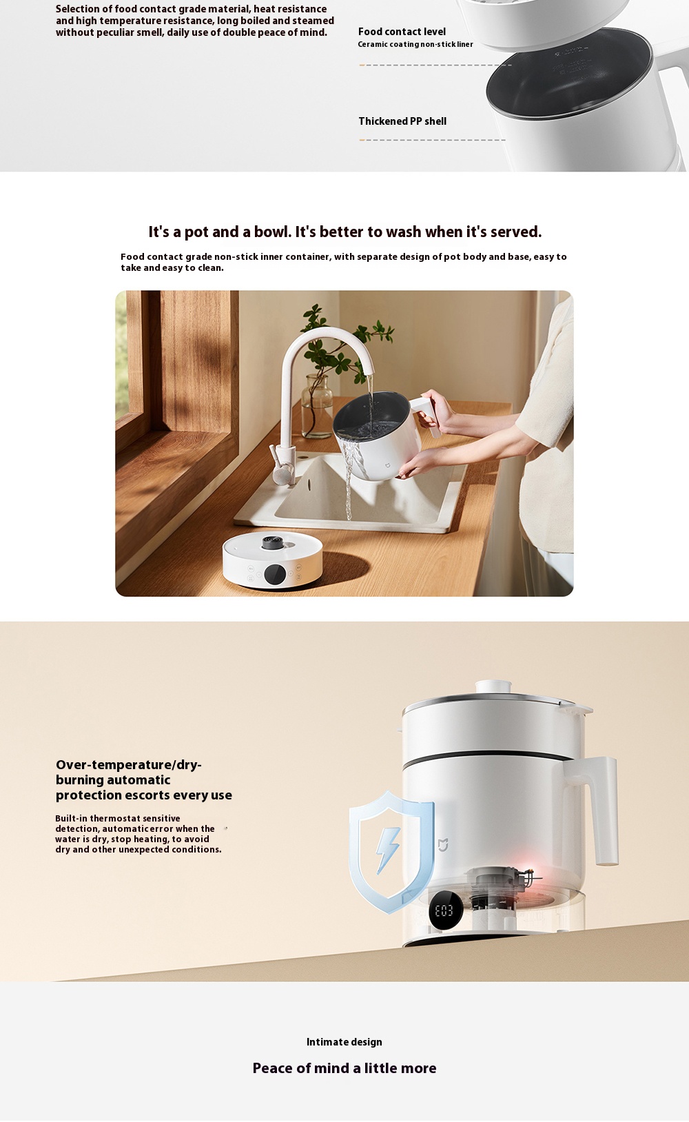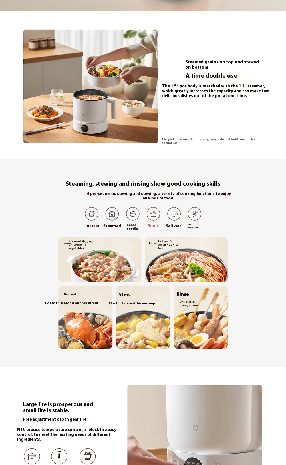 - Dual-layer Cooking Capacity: The 1.5L pot is paired with a 1.2L steamer tray, providing an expanded cooking capacity. This dual-layer design lets you cook different dishes simultaneously, saving time and enhancing kitchen productivity.