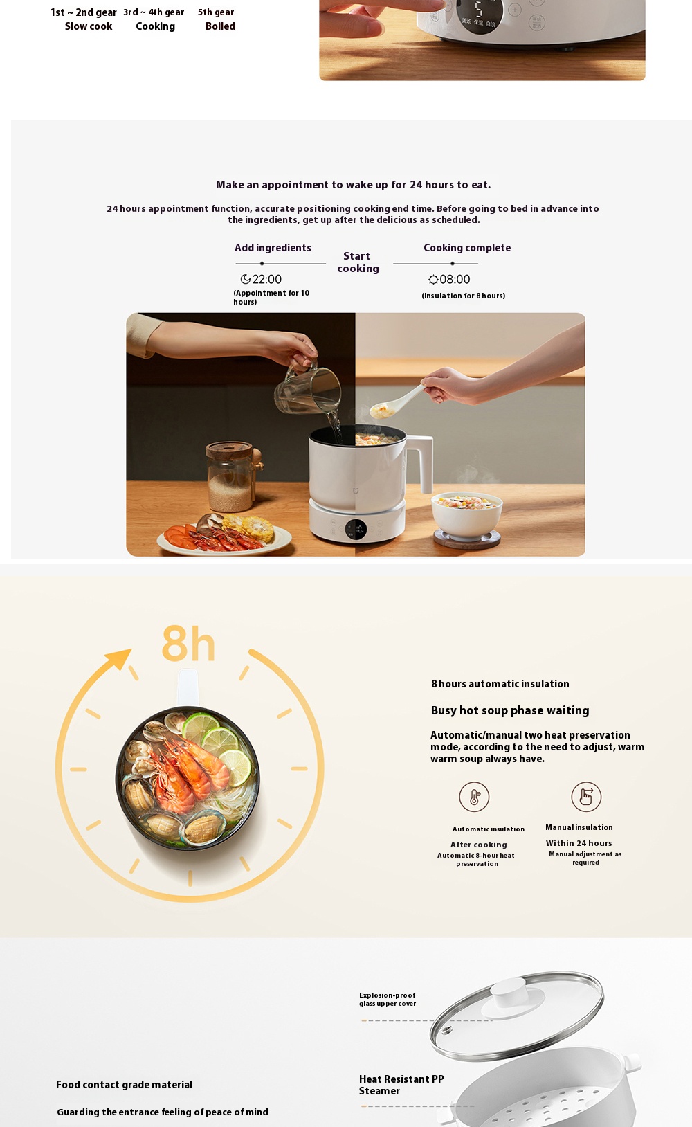 - Five Adjustable Heating Levels: Featuring precise NTC temperature control, the cooker offers 5 variable heating levels. Easily switch between slow cooking, steaming, and boiling to match the specific requirements of different ingredients.