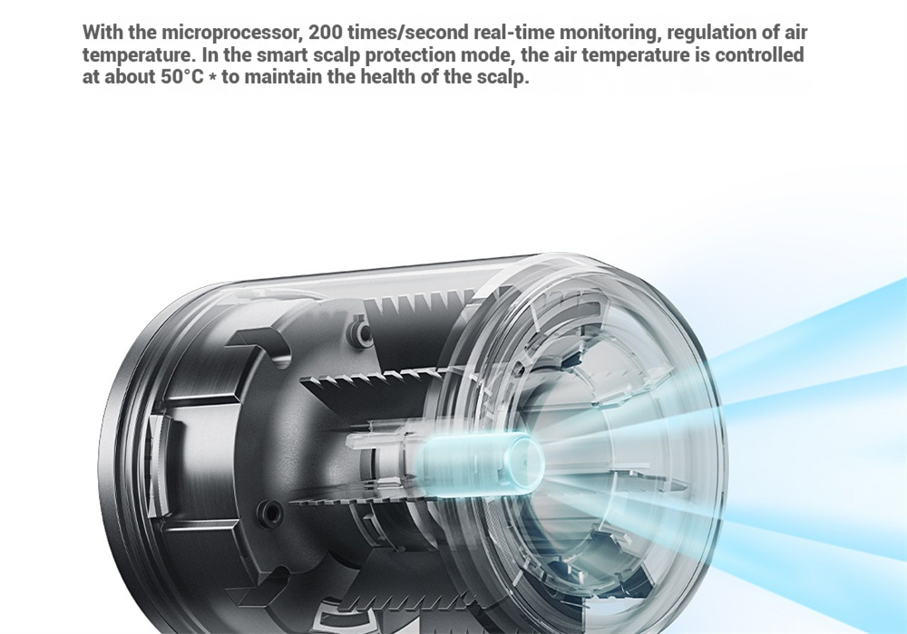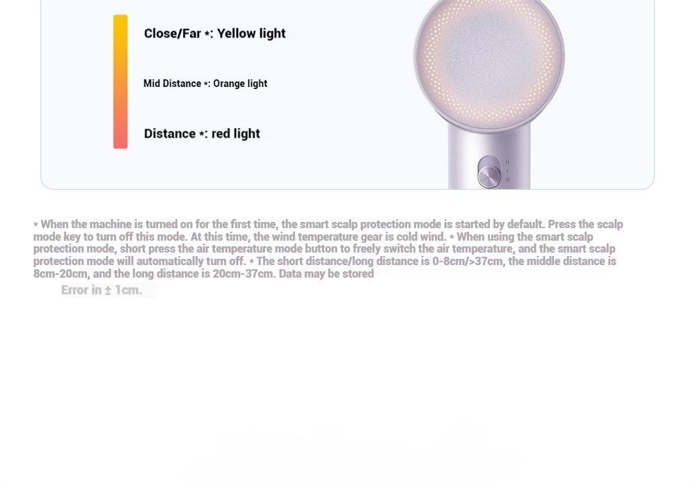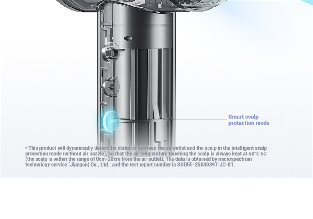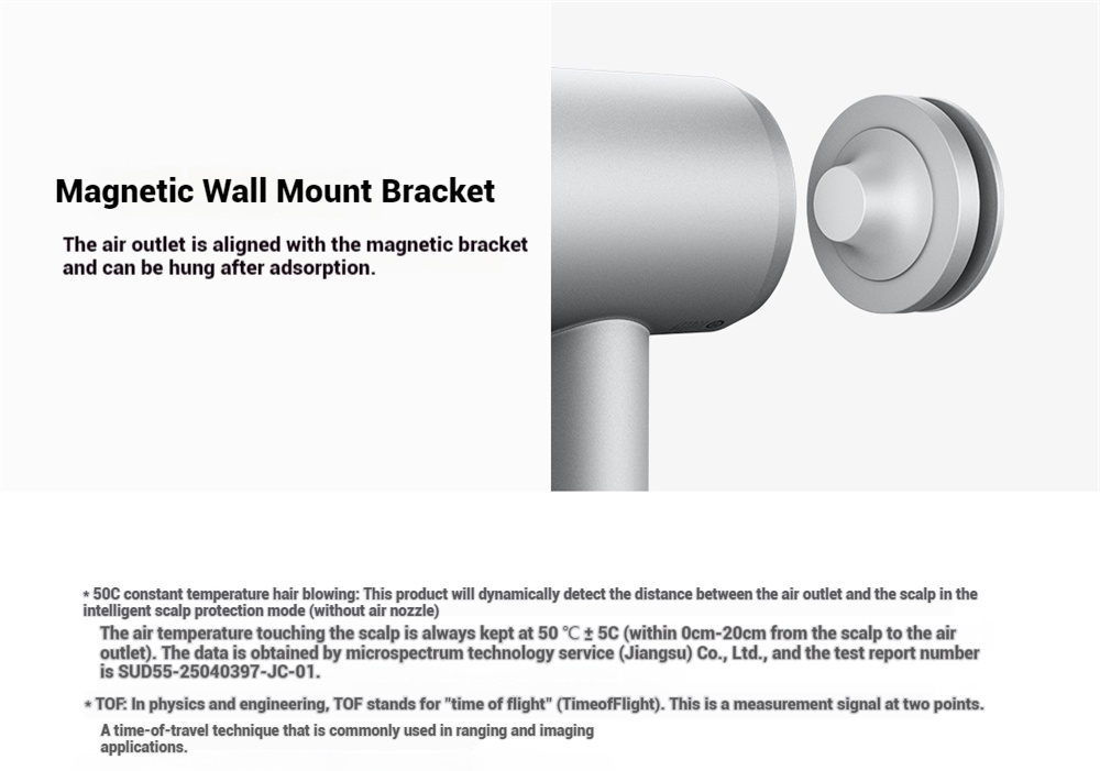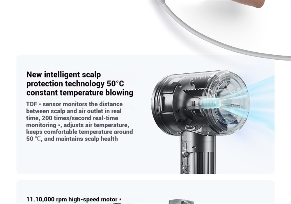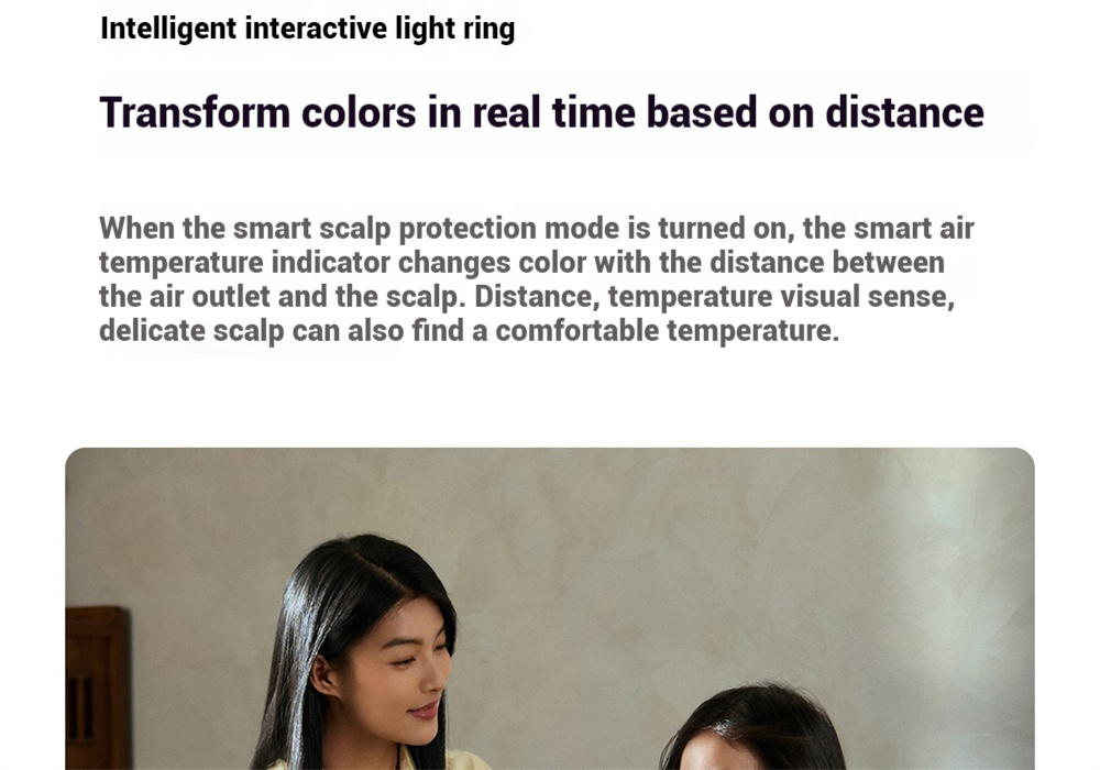 - 50 °C Constant-Temperature CareBuilt-in TOF sensor measures scalp distance in real time, adjusting airflow temperature to maintain a safe 50 °C. Accelerates drying while protecting scalp health and preventing heat damage. - Ultra-Quick Drying PerformancePowered by an 110,000 rpm motor generating 70 m/s wind speed, this dryer delivers a quick-dry in just 30 seconds. Efficiently removes water with minimal exposure to heat. - 200 Million Negative IonsRich negative-ion output smooths frizz and seals hair cuticles for shinier, silkier results. Leaves hair soft and manageable with every use. - Intelligent LED Lamp RingColor-changing ring indicates distance and temperature in scalp-protect mode: yellow for too close/far, orange for optimal (8–20 cm), red for farther (20–37 cm). Visual real-time feedback ensures safe styling. - Custom Modes & Magnetic AccessoriesChoose from five temperature settings (including scalp-protect mode) and two fan speeds, with auto-memory of your last setting. Magnetic nozzles, filter cover, and wall-mount bracket provide quick attachment, precise styling, and easy cleaning.