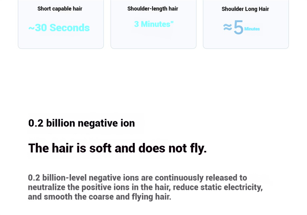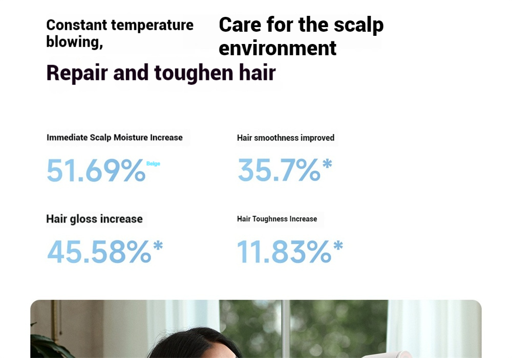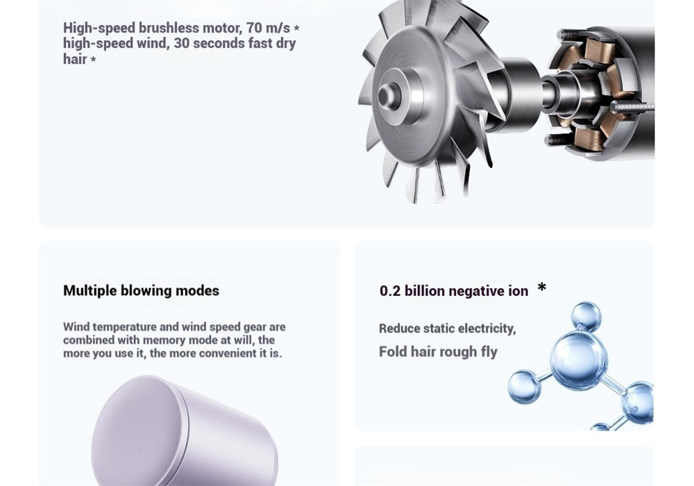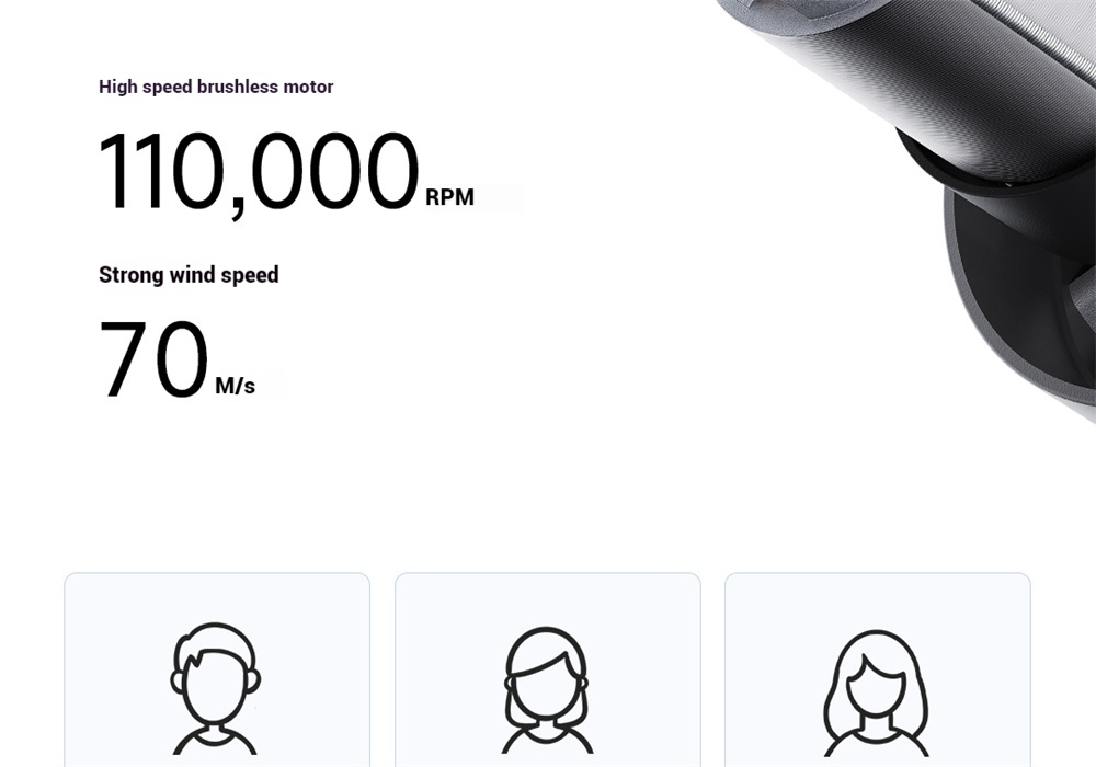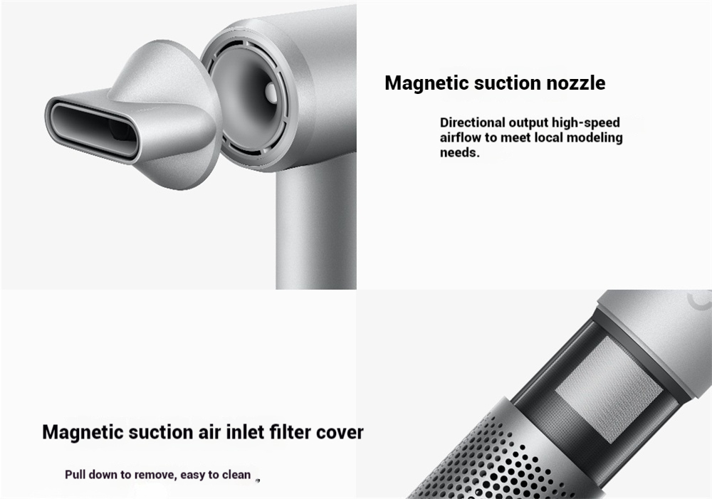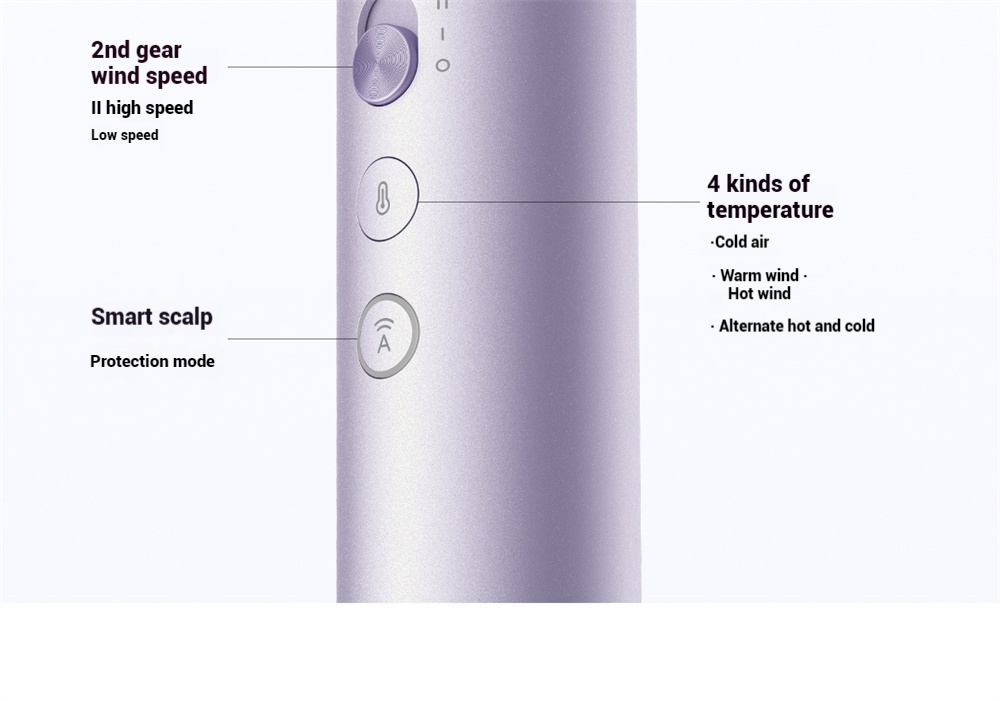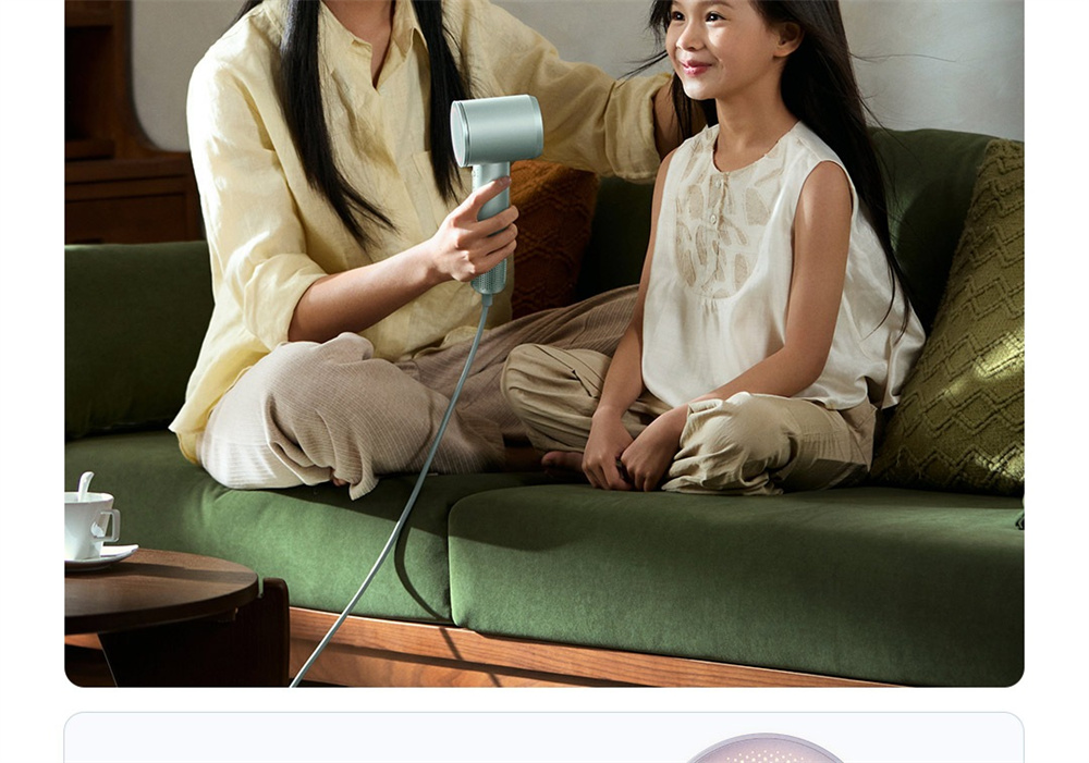 - 50 °C Constant-Temperature CareBuilt-in TOF sensor measures scalp distance in real time, adjusting airflow temperature to maintain a safe 50 °C. Accelerates drying while protecting scalp health and preventing heat damage. - Ultra-Quick Drying PerformancePowered by an 110,000 rpm motor generating 70 m/s wind speed, this dryer delivers a quick-dry in just 30 seconds. Efficiently removes water with minimal exposure to heat. - 200 Million Negative IonsRich negative-ion output smooths frizz and seals hair cuticles for shinier, silkier results. Leaves hair soft and manageable with every use. - Intelligent LED Lamp RingColor-changing ring indicates distance and temperature in scalp-protect mode: yellow for too close/far, orange for optimal (8–20 cm), red for farther (20–37 cm). Visual real-time feedback ensures safe styling. - Custom Modes & Magnetic AccessoriesChoose from five temperature settings (including scalp-protect mode) and two fan speeds, with auto-memory of your last setting. Magnetic nozzles, filter cover, and wall-mount bracket provide quick attachment, precise styling, and easy cleaning.