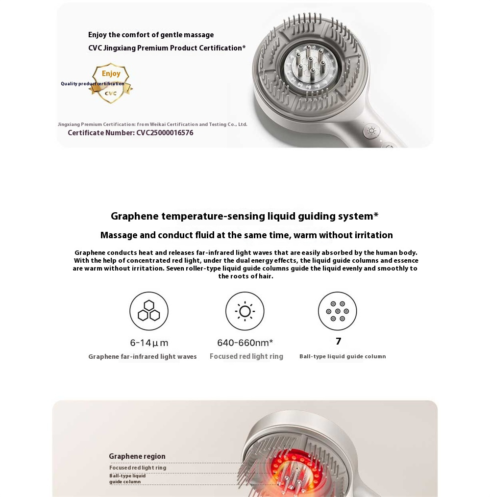 - Graphene Warm Care with Concentrated Red Glow: Graphene heating releases skin-friendly warmth, while focused red illumination supports a relaxing experience. Seven metal rolling nozzles guide liquid evenly along the scalp surface, helping serums reach the roots smoothly and comfortably.
