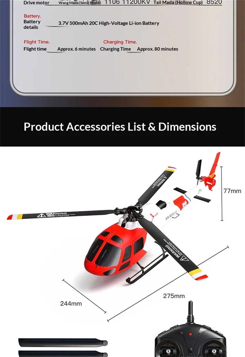 3> Utilizes a powerful 1106 outrunner brushless motor and a 3.7V 500mAh 25C high-discharge battery.