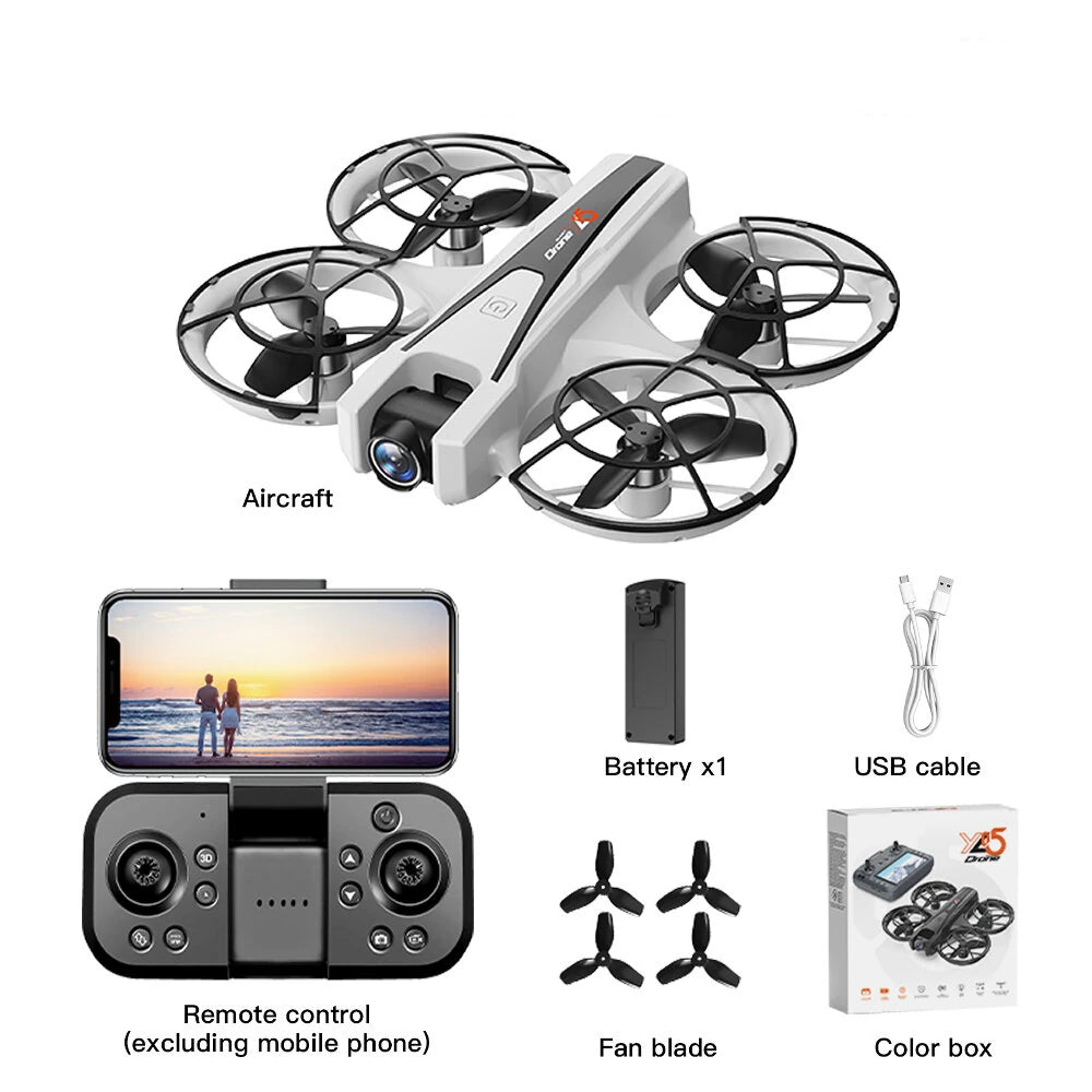 Up/down/forward/backward, left/right turn, sideways flight, LED lights, 360° stunt roll, headless mode, one-button automatic return, altitude hold mode, WiFi FPV, dual-lens switchable, supports horizontal/vertical/overhead shooting, lens can be electrically adjusted 90°, Screen Controller, Optical flow positioning