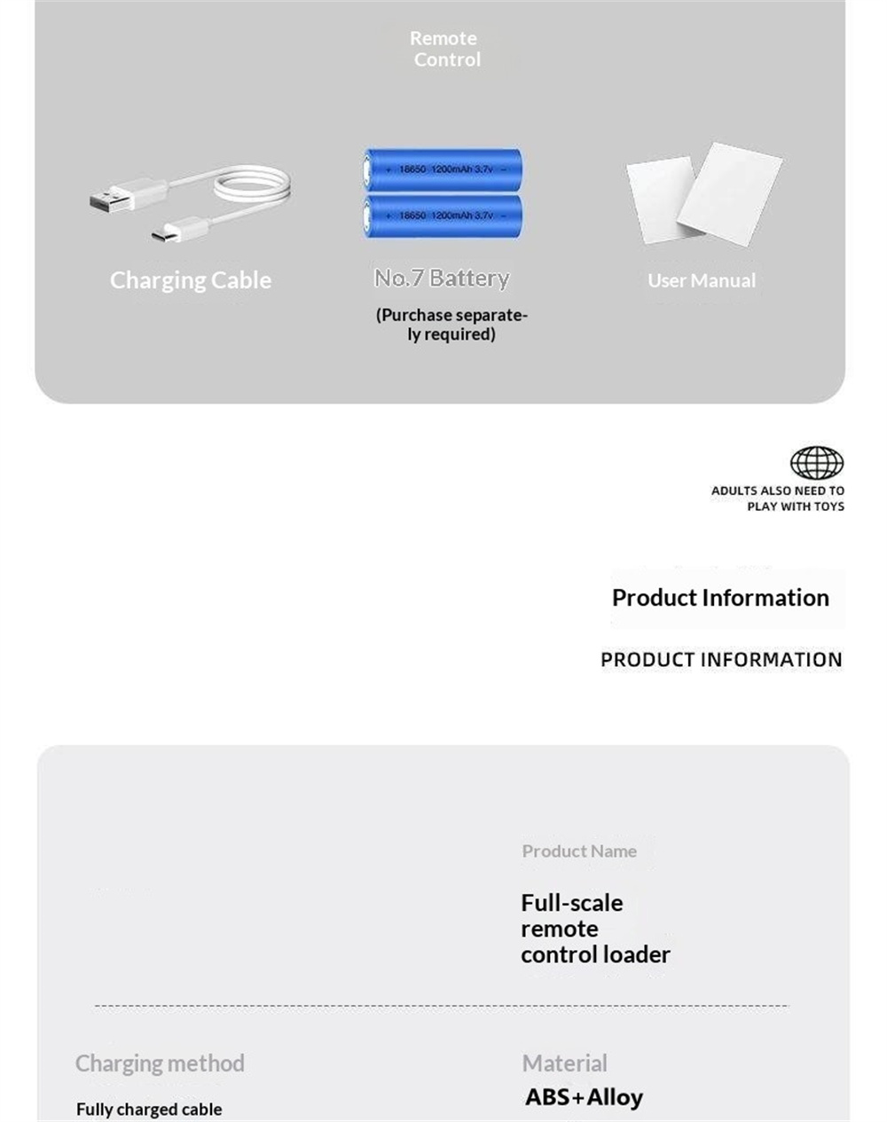 Battery for the Bulldozer Truck:3.7V 200mAh Li-ion battery(included) Battery Charging Time:About 2-3 hours Battery Using Time:About 15-20 minutes |